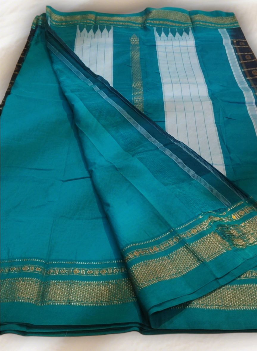 Dark Blue And Teal Temple Border Zari Checks With Butta Saree