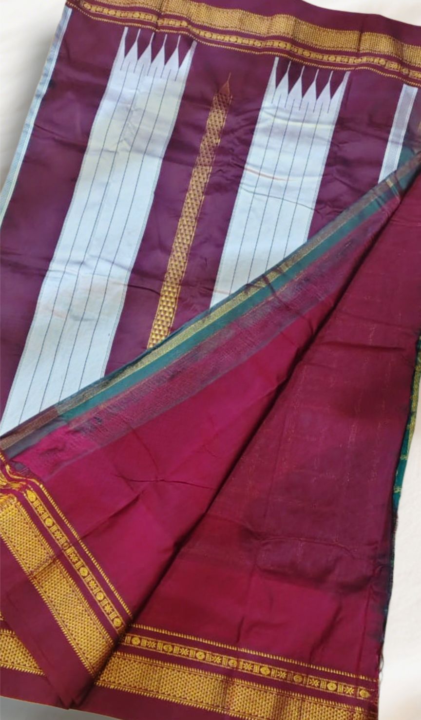 Deep Teal And Maroon Temple Border Zari Checks With Butta Saree