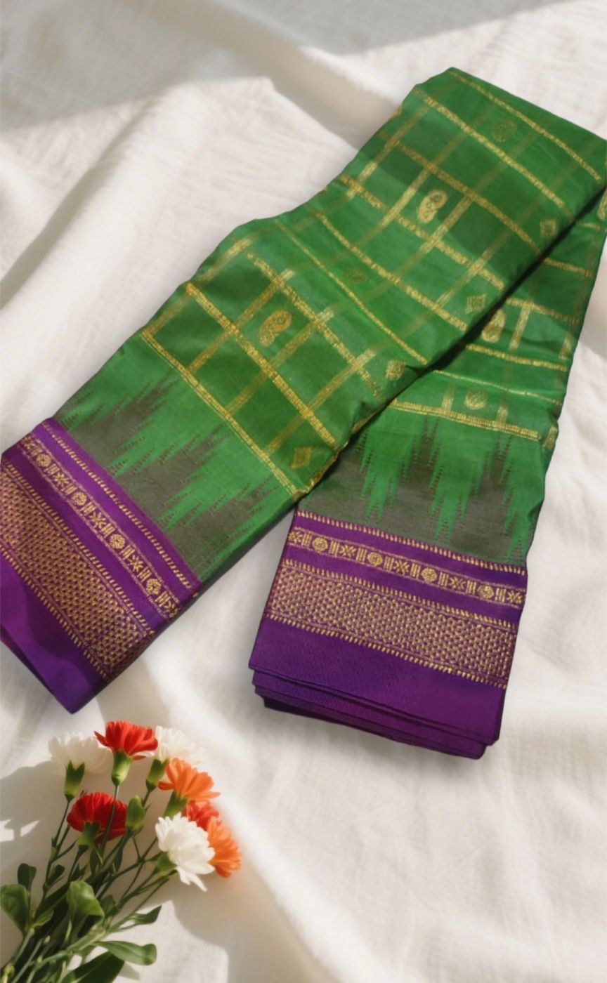 Green And Magenta Temple Border Zari Checks With Butta Saree
