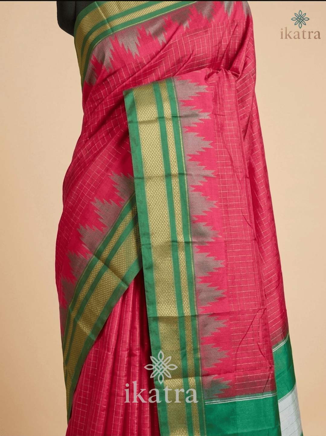 Green And Magenta Temple Border Zari Checks With Butta Saree