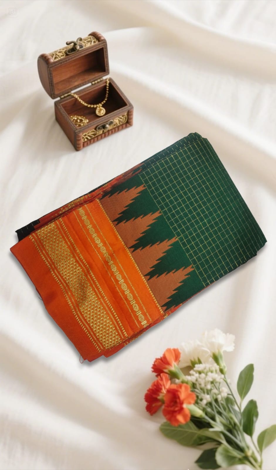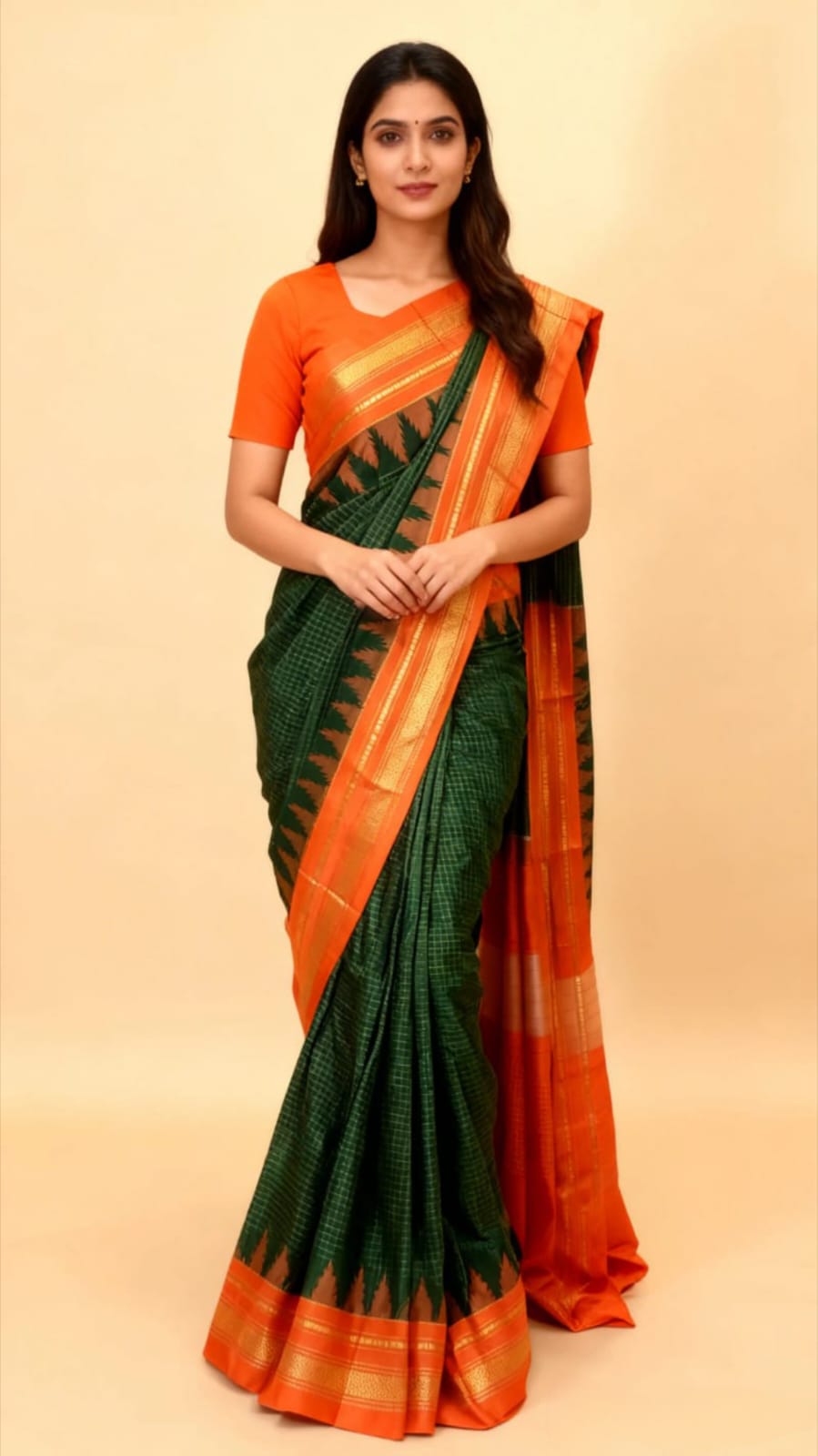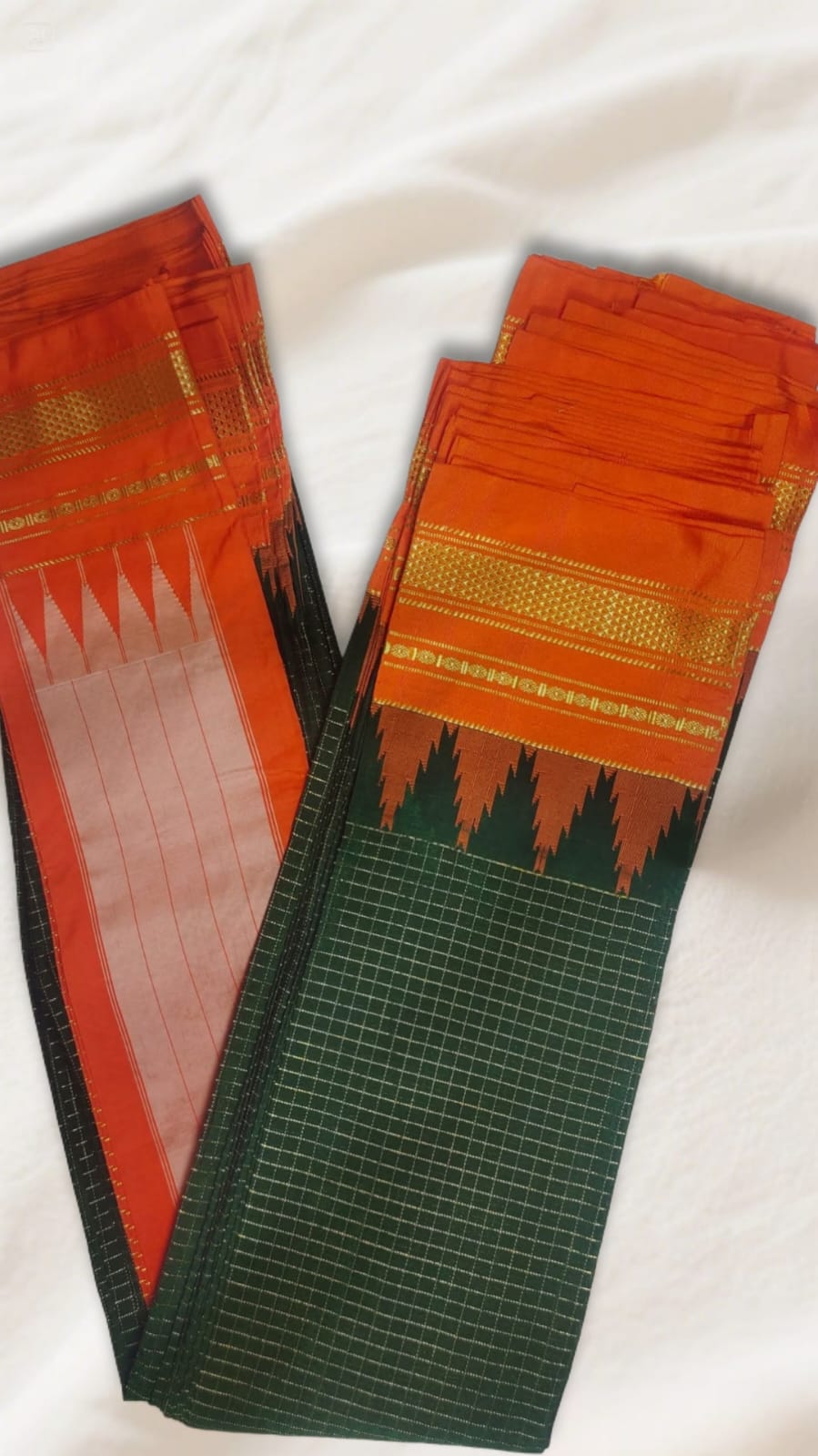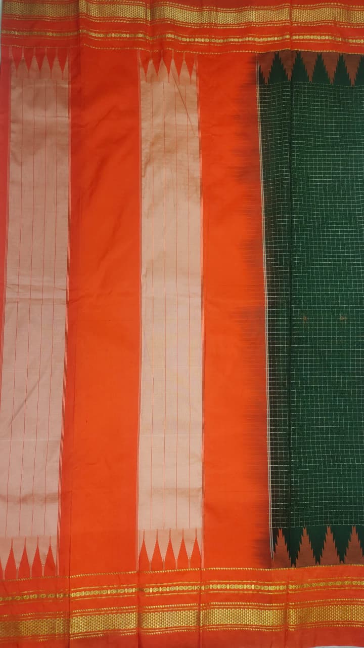 Orange green Temple Border with Chikki Paras Zari Checks ilkal Saree