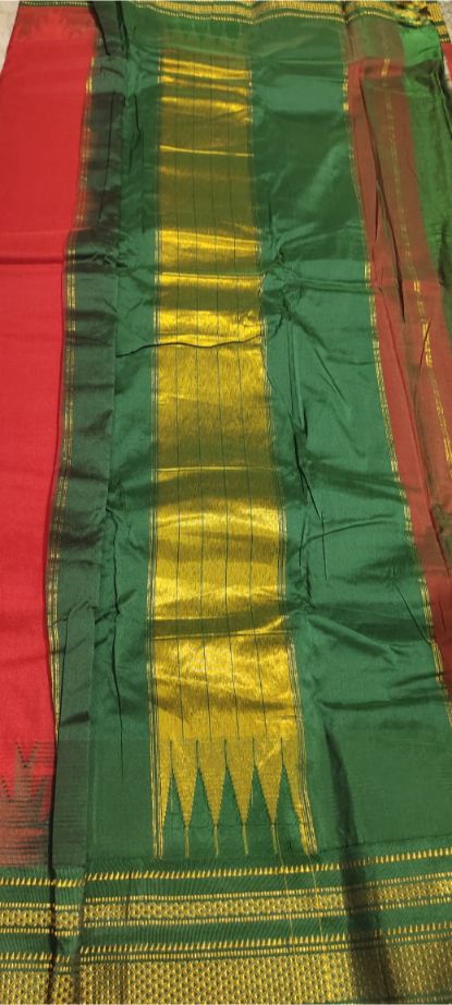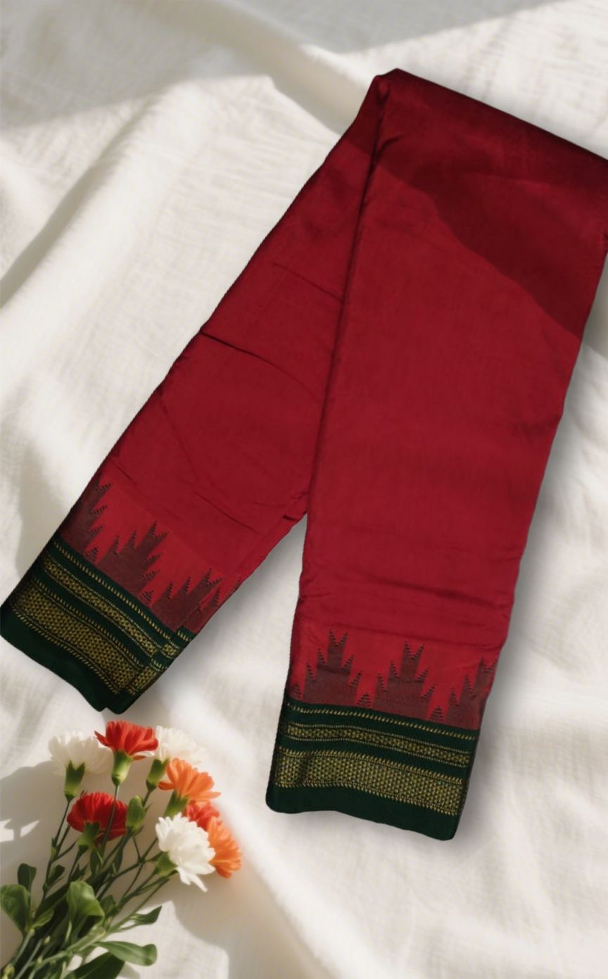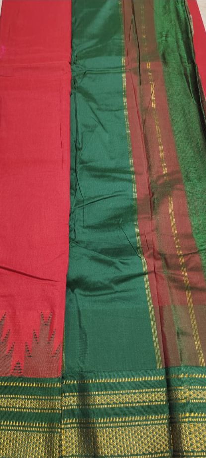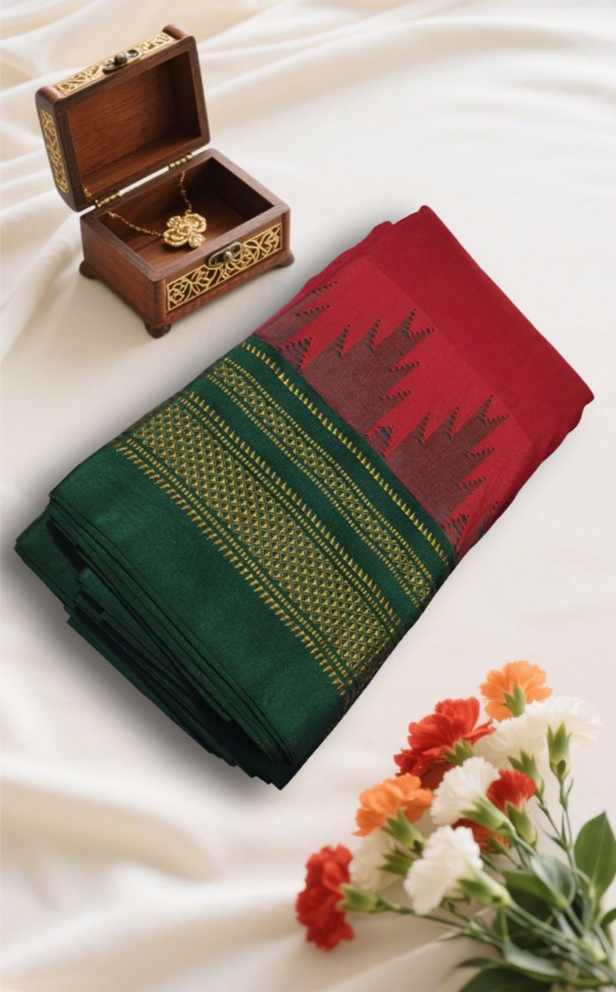 Red And Dark Green Big Temple Plain Ilkal Saree | ikatra