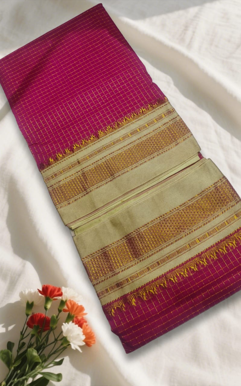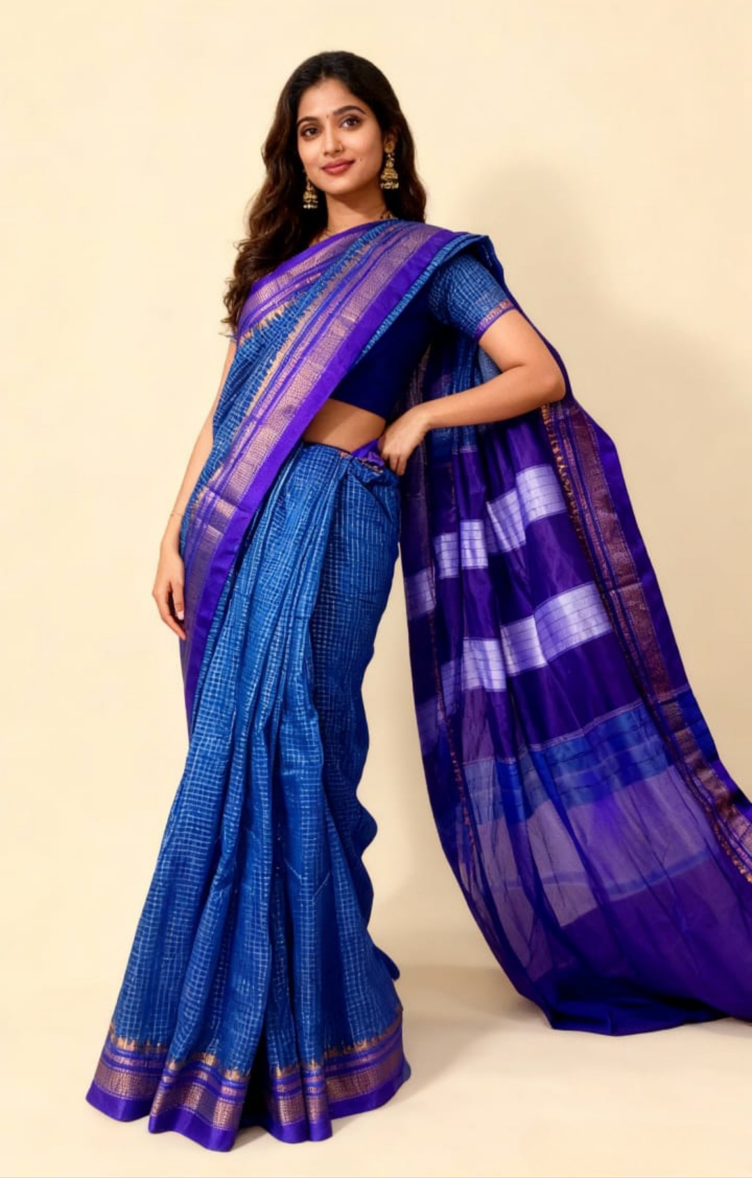 Celebrate everyday tradition with Ikatra’s Tana Kaddi Checks Ilkal Saree — a perfect blend of rustic charm and comfort. Woven in classic checked patterns, this cotton saree features the signature Chikki Paras border and a rich silk pallu, capturing the timeless appeal of Ilkal weaves. Paired with a contrast blouse, it’s ideal for cultural get-togethers, workwear elegance, or relaxed festive dressing