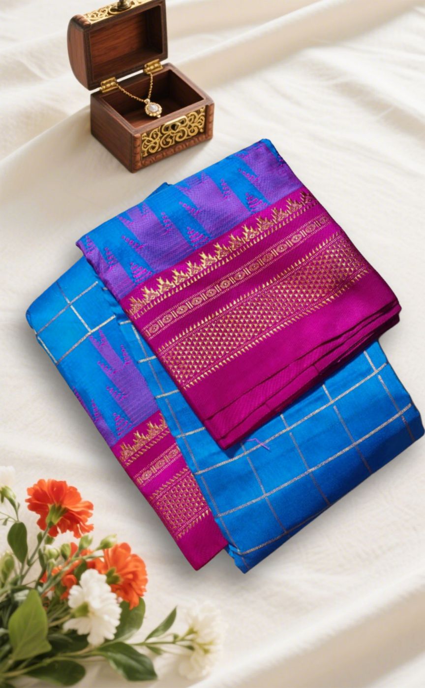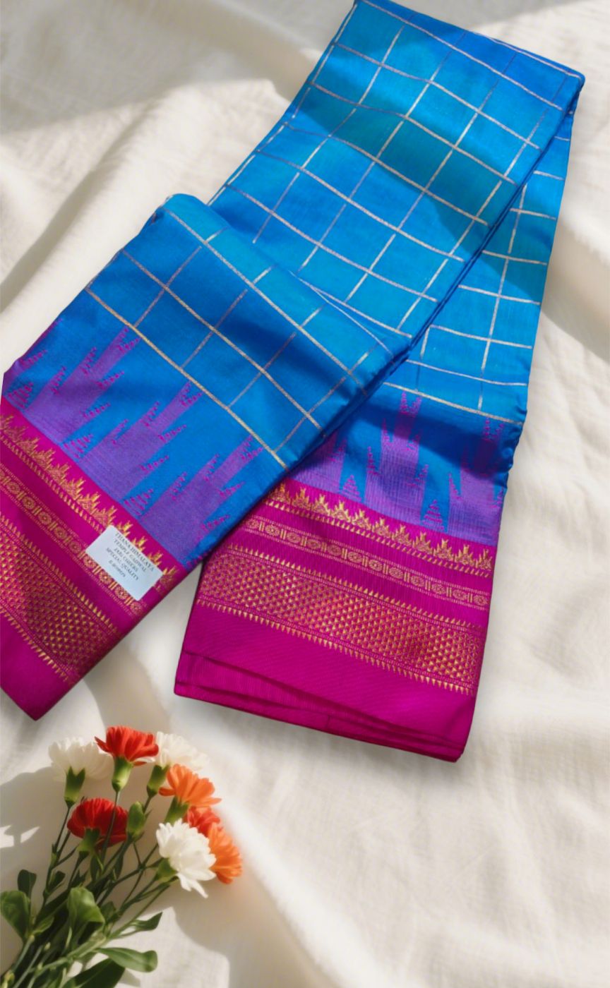 Sky Blue And Pink Traditional Ilkal Jari Checks Saree with Temple Border