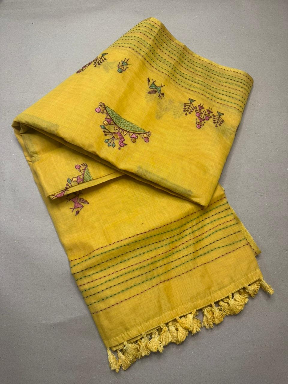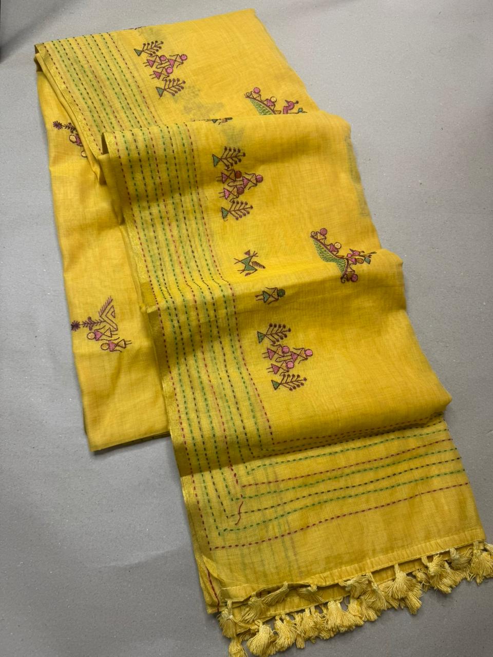 Saree Name: Women’s Tribal Warli Embroidery Work with Kanta Stitch Cotton Saree